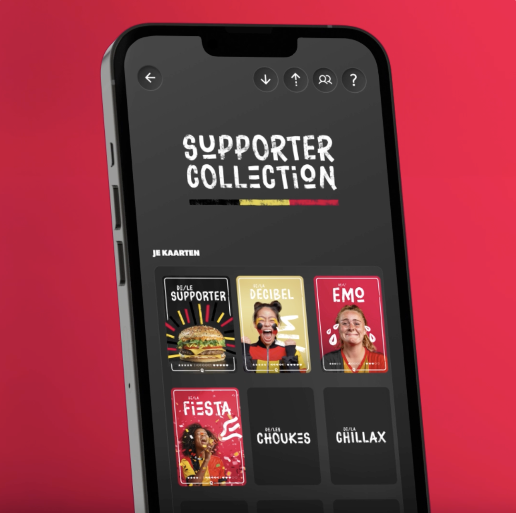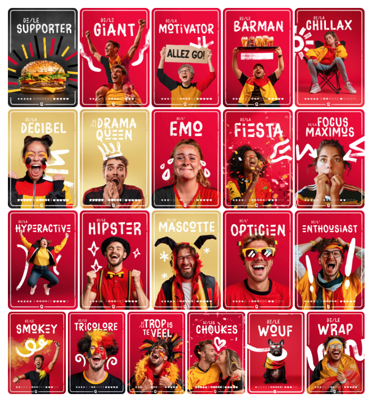 The 'Supporter Collection' contains 21 digital cards, representing different profiles of Belgian supporters. These include the 'Drama Queen', the 'Decibel' and the 'Hyperactive'. The aim of game? To collect the complete collection. To do so, Quick lovers have to order a Supporter at Quick, to receive 4 digital cards in their MyQuick app. At the end of the campaign, 5 winners each receive a budget of €1,000, to use to support their favourite sport(s).
