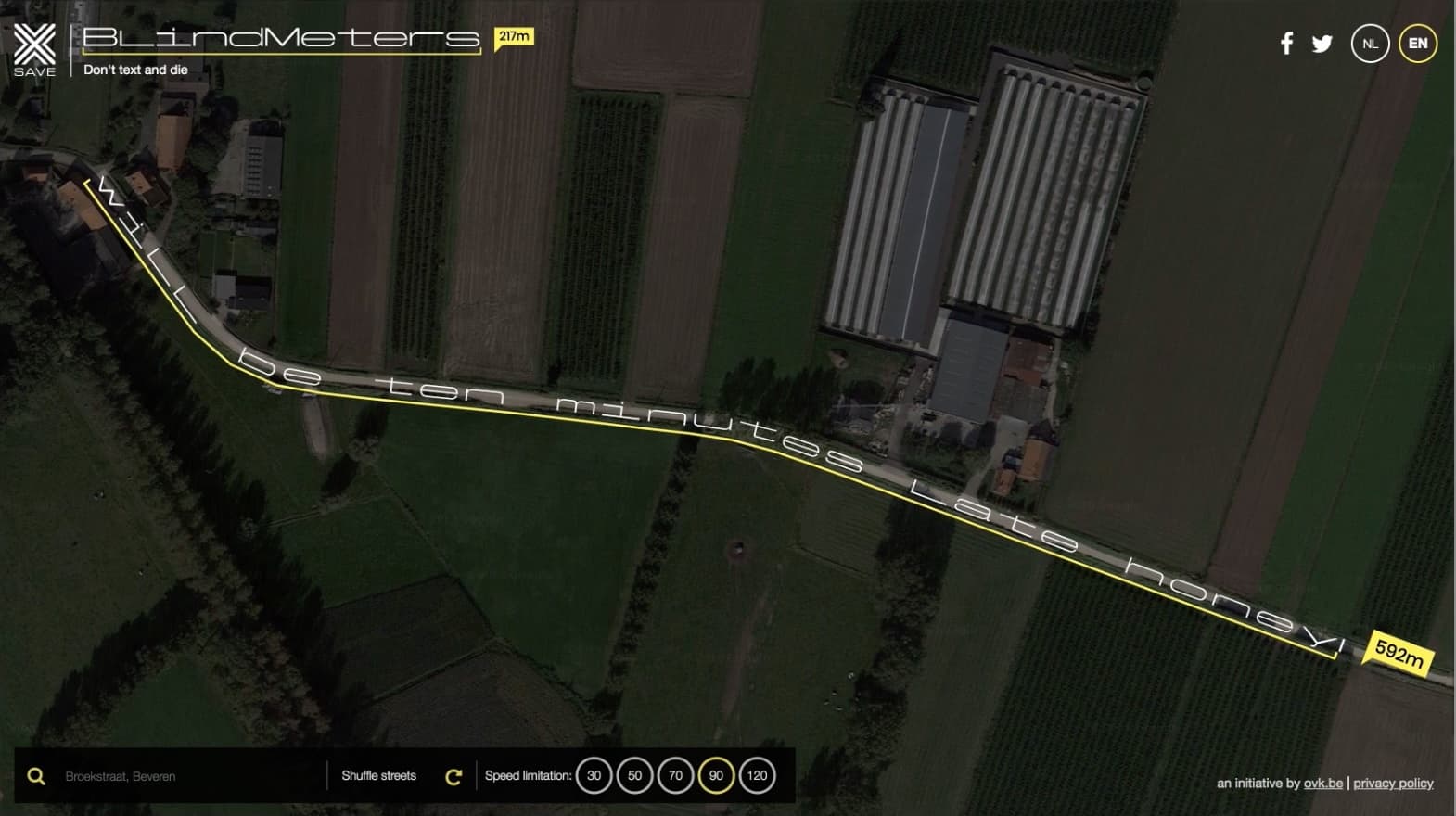A custom-made font connects to the speed limitation data of the specific road you’re typing on and stretches to the exact number of meters you miss when texting and driving. To do so we programmed an algorithm that connects different databases and layers them onto one website, together with a specially designed font made for the purpose of dynamically stretch.
