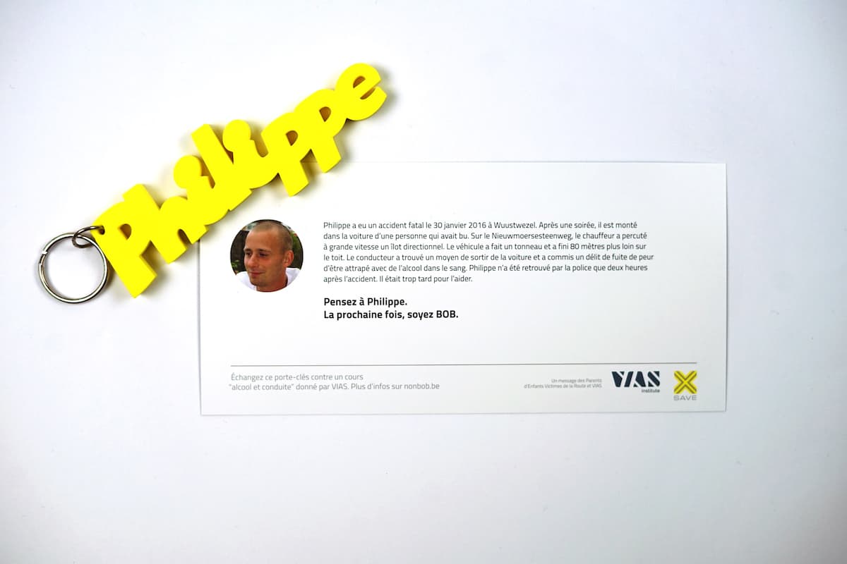 That is why Belgian Traffic Institute VIAS and the organisation Parents of Road Victims are launching a remarkable campaign: in addition to the well-known Bob key ring for responsible drivers, the police will also hand out key rings to drivers who did drive under the influence. No Bob key rings of course, but key rings with the names of children who fell victim to a driver driving under the influence: Axelle, Corwin, Nathan, Laetitia, ...