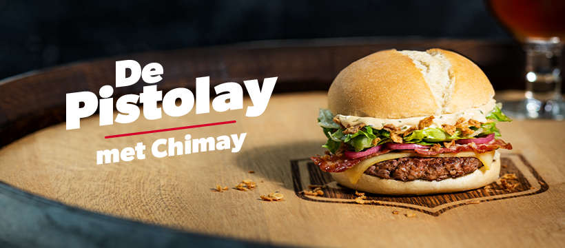 The Pistolay is a masterful delicacy, based on tradition ánd inventiveness. It has a 100% Belgian beef burger on a bed of iceberg lettuce, topped with two slices of bacon. Then: a slice of creamy Chimay cheese and a delightful sauce based on Chimay trappist beer, topped with pickled red onions and crispy onions. Add a ‘pistolet’, that typical Belgian bun, and you have a burger that nobody would say 'Pisto-nay' to.